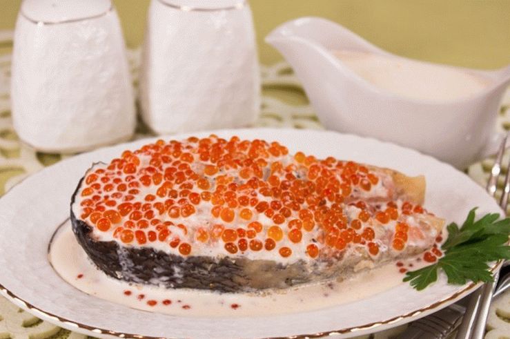- पन्नी से मुक्त ठंडा मछली, एक प्लेट पर डाल दिया, डालना मलाईदार कैवियार सॉस।