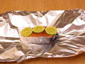 - सामन के स्लाइस पन्नी पर डालते हैं, हल्का नमक, काली मिर्च, मछली पर चूने के घेरे लगाएं।