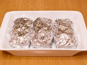 - पन्नी में मछली बंद करें, बेकिंग डिश में स्थानांतरित करें।