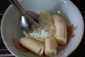 - ब्लेंडर बाउल में पनीर और केला रखें और पीस लें सजातीय द्रव्यमान।