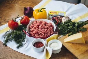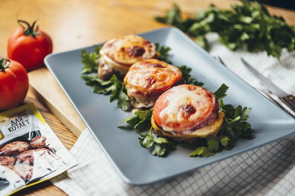- टमाटर सॉस के साथ हल्के से ग्रीस कटलेट, प्रत्येक पर फैल गया काली मिर्च की एक अंगूठी और प्याज का एक चक्र कटलेट।