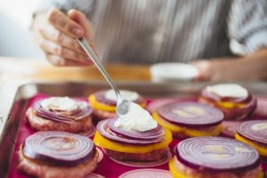 - हल्के से खट्टा क्रीम या मेयोनेज़ के साथ प्याज को चिकना करें।