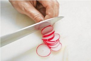 - मूली को बारीक काट लें। त्वचा और कोर से सेब छीलें, स्ट्रिप्स में काट लें, और छोटे छल्ले में लीक।