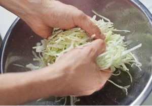 - गोभी को स्ट्रिप्स में काटें, नमक और एक चुटकी चीनी के साथ छिड़के, सिरका और तेल के साथ मौसम। हाथ मिलाएं और पाँच के लिए छोड़ दें मिनट।