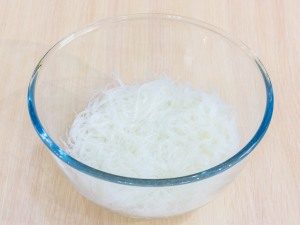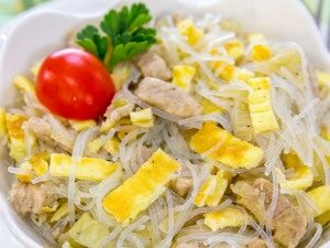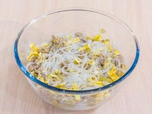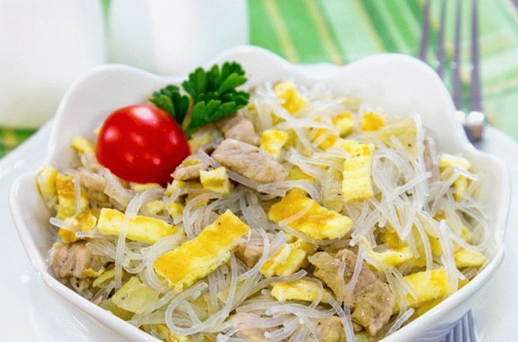 एक स्वादिष्ट हार्दिक सलाद एक दिलचस्प घटक के साथ घर पर पकाया जाएगा – कटा हुआ अंडा पैनकेक, एशियाई में एक डिश तरीके। करने के लिए निर्देशों के अनुसार कांच नूडल्स कवक उबाल लें पैकेजिंग।
