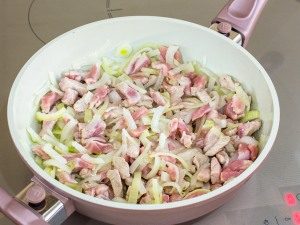 - मक्खन के साथ एक पैन में प्याज भूनें, पोर्क डालें, स्ट्रिप्स में कटौती, मसाले के साथ सीजन, तलना, सरगर्मी, के बारे में 25 मिनट