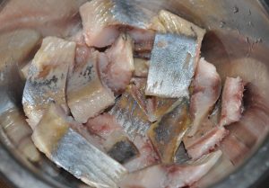हेरिंग काटकर मध्यम आकार के टुकड़ों में काट लें।