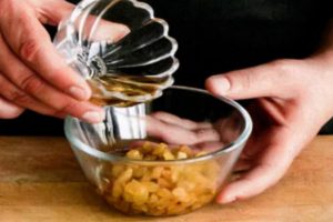 किशमिश को भिगोने के लिए पहला कदम है। ऐसा करने के लिए, इसमें डुबकी लगाएं रम और वहाँ आधे घंटे के लिए छोड़ दें।