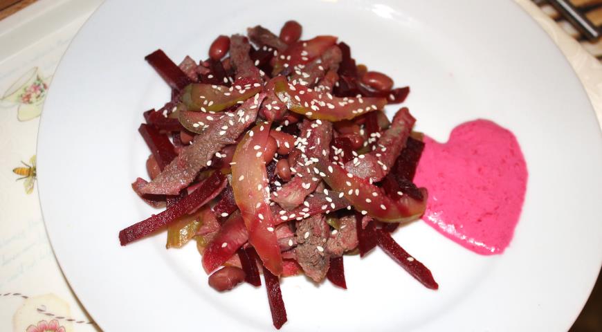 जीभ और चुकंदर की चटनी के साथ स्वादिष्ट सलाद मेरी रेसिपी के अनुसार घर पर खाना बनाना एक बहुत ही स्वादिष्ट सलाद है रोमांटिक डिनर। और सॉस से आप दिल बना सकते हैं!