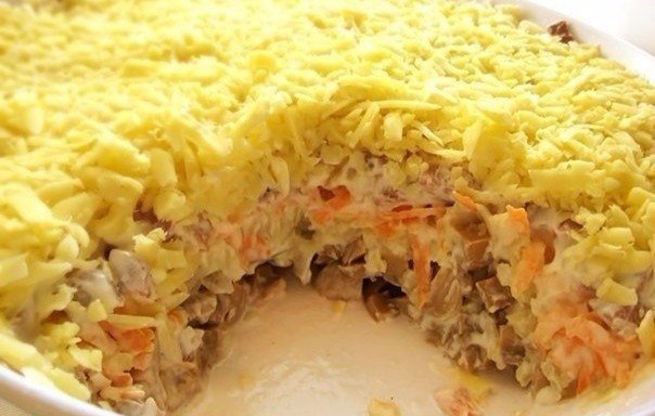 डिश पर परतों में फैला हुआ: डिब्बाबंद शैंपेन, कसा हुआ आलू, लहसुन के साथ गाजर, मेयोनेज़।