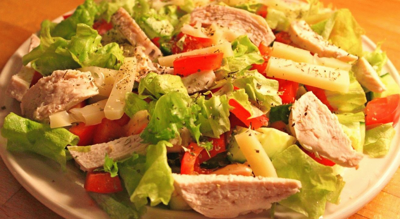चिकन और सब्जियों के साथ स्वादिष्ट घर का बना सलाद। अपने भोजन को स्वस्थ और कैलोरी में कम करें।