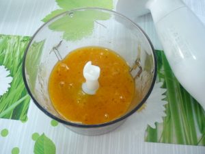 - हमने कई हिस्सों में ख़ुरमा काटा और एक ब्लेंडर में मैश किया।