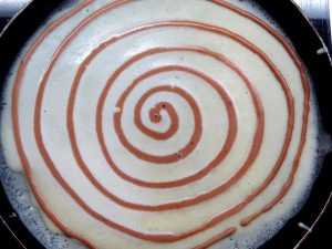- हम पैन को गर्म करते हैं और सफेद आटा डालते हैं, पैनकेक चाहिए न ज्यादा पतला और न ज्यादा गाढ़ा। शीर्ष सर्पिल केंद्र चॉकलेट आटा डालना। हम दोनों पक्षों पर पेनकेक्स सेंकना।